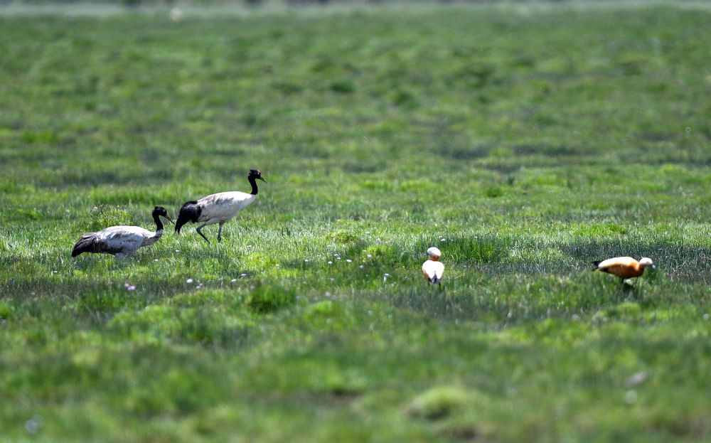 2022年7月2日,兩只黑頸鶴(左一和左二)在青海隆寶國家級(jí)自然保護(hù)區(qū)內(nèi)活動(dòng)。新華社記者 韓方方 攝