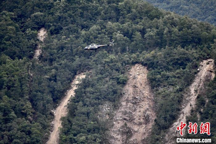 救援直升機(jī)轉(zhuǎn)運(yùn)傷員,山體垮塌痕跡赫然可見。張浪 攝