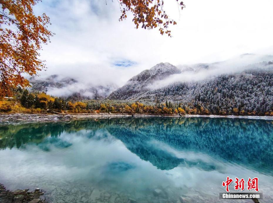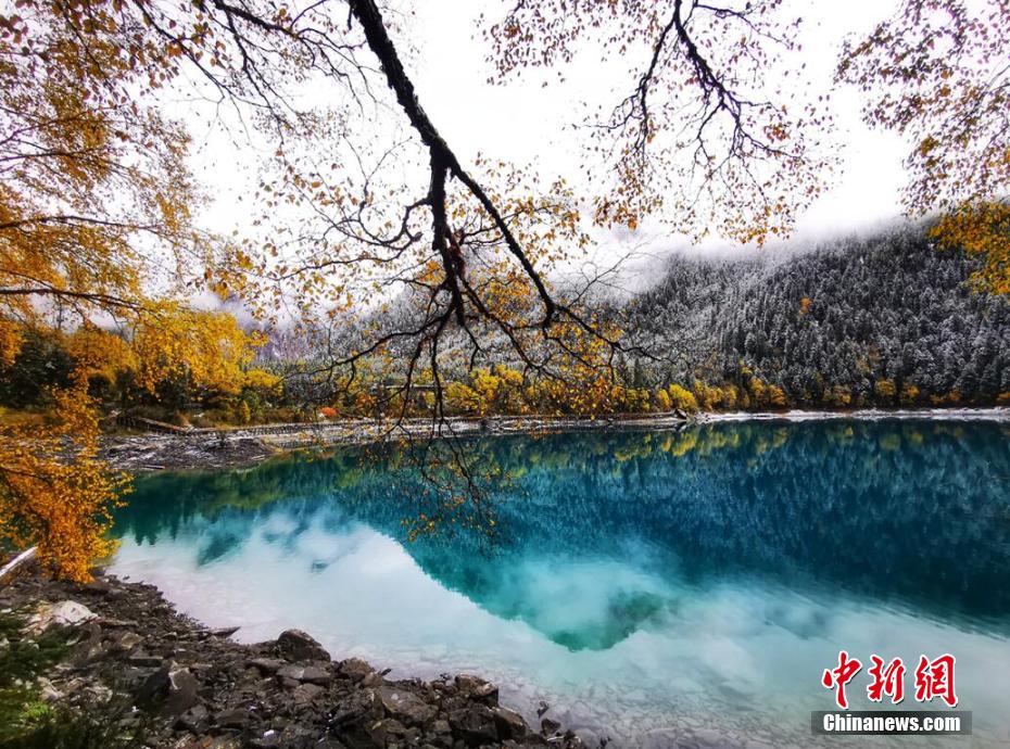 十月,九寨溝長海、原始森林等景點迎來入秋后的第一場雪。澄凈碧藍的海子和金色的彩林與潔白的雪花相映相襯,構(gòu)成一幅靜謐的美麗畫卷。遠遠看去,成片的彩林被一朵朵雪花點綴,美得像童話世界一般。 梁峰 攝