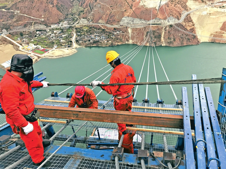 工人們架設(shè)橋梁纜索。