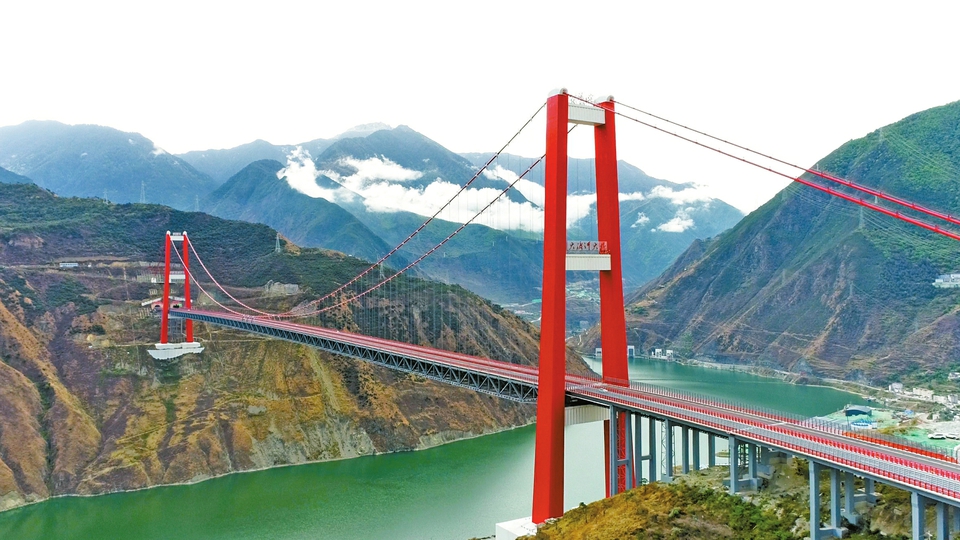 瀘定大渡河大橋位于甘孜州瀘定縣瀘橋鎮(zhèn)咱里村,全長1411米,其中主跨1100米,是雅康高速公路的控制性工程。“瀘定大渡河大橋是四川盆地進入青藏高原的第一座千米級橋梁。”該項目設(shè)計主審人、四川省公路規(guī)劃勘察設(shè)計研究院有限公司副總經(jīng)理蔣勁松說,設(shè)計采用了大跨橋梁跨越大渡河河谷,避免了路線的起伏攀升,并使得雅安到康定的總里程最短,實現(xiàn)通行效率最大化。