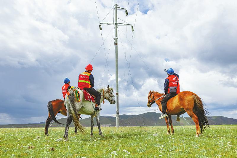 近日,國(guó)網(wǎng)石渠供電公司工作人員騎馬巡檢,排查線路隱患。洛絨尼瑪 攝