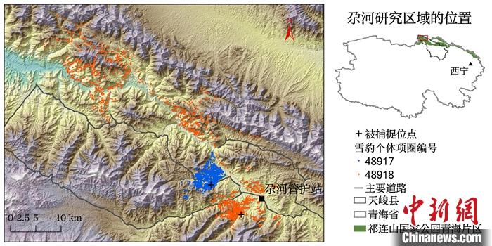 圖為“祁跡”“祁妙”活動(dòng)范圍圖,藍(lán)色為“祁跡”,紅色為“祁妙”。 中新社發(fā) 祁連山國家公園青海省管理局 供圖