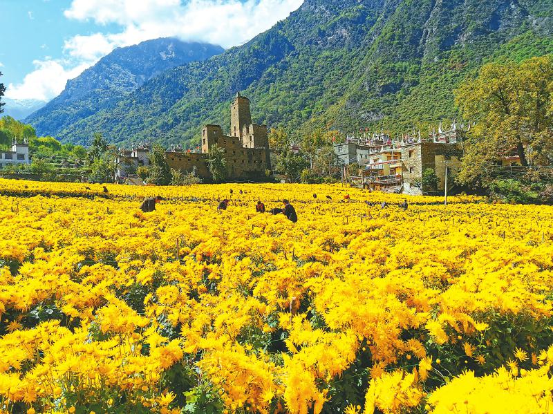 丹巴縣巴底鎮(zhèn)邛山土司官寨文旅融合鄉(xiāng)村振興示范點(diǎn)之金絲皇菊種植基地。