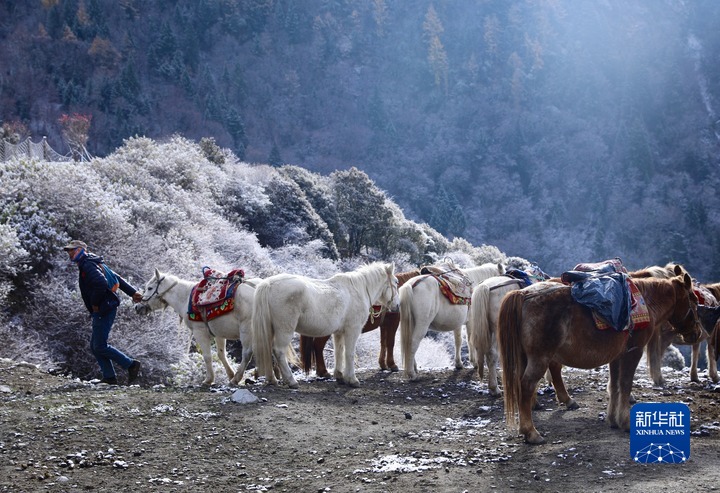 11月8日,工作人員在四姑娘山長坪溝景區(qū)內(nèi)牽馬行走。新華社記者 劉瓊 攝