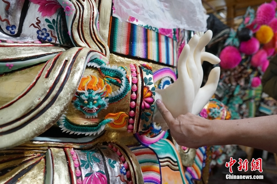 2月1日,在位于青海省西寧市湟中區(qū)境內(nèi)的藏傳佛教名剎塔爾寺內(nèi),藝僧為酥油花主佛做最后修飾。