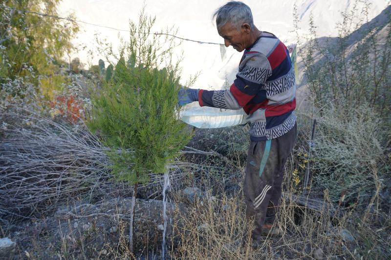1950年出生在茂頂村木達水村民小組的丁爭,小時候多次看到雨季村里洪水成災,泥石流橫行,山體滑坡的場景。那時經(jīng)濟落后,村民日子過得苦。丁爭隨母親去頭人家放牛,由于天氣炎熱,饑渴難耐,母親就摘一個頭人家蘋果充饑,被頭人關(guān)了3天3夜。1957年,迪慶發(fā)展迎來新曙光,丁爭家分到了田、牲畜、果樹,當家做主人,從此過上了新生活。2007年,丁爭兒孫滿堂,家務事不用操心,他就想植樹造林、保護生態(tài),防止山洪暴發(fā)和水土流失,造福子孫后代。于是,他拿著家里的鎬、盆,踏上植樹造林的漫漫長路。 在植樹造林的初期,丁爭老人靠自家的舊桶舊盆給樹苗澆水。隨著旭龍電站、忠態(tài)水庫等項目進場施工,丁爭老人就撿拾一些舊水管、舊鐵絲,把水引到離幼苗最近的地方,以便澆水。用廢棄的鐵絲把樹苗固定好,以免風吹雨打樹苗飄搖致根系斷裂,影響生長。起初由于管理經(jīng)驗不足,澆水困難,1年種100棵樹苗,成活僅幾棵,但他沒有退縮,沒有喪失信心,查找成活率不高的原因,采取相應的改進措施,逐年提高了樹苗成活率。