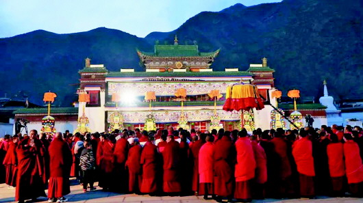 拉卜楞寺大經(jīng)堂門(mén)樓前陳列出九尊工藝精湛、用酥油塑成的佛像,眾僧列隊(duì)、朗誦經(jīng)文,僧俗群眾共同祈祝新的一年吉祥安康,慕名前來(lái)的國(guó)內(nèi)外游客,紛紛拍照留影,寺院熱鬧非凡,場(chǎng)面蔚為壯觀。
