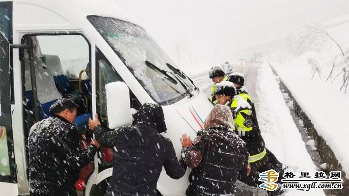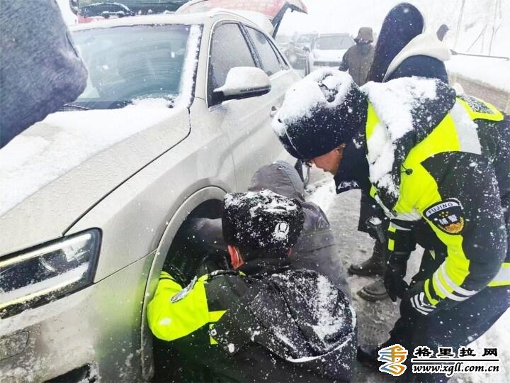 2月22日,大雪使白馬雪山路面積雪結(jié)冰,導(dǎo)致上百輛汽車擁堵滯留,交警冒著嚴寒疏導(dǎo)交通。