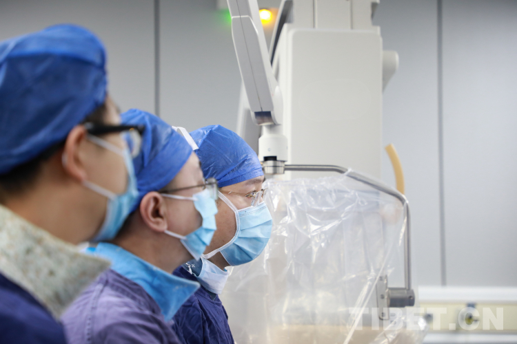 圖為北醫(yī)三院院長(zhǎng)助理唐熠達(dá)教授(右一)帶領(lǐng)專家團(tuán)隊(duì)在為來自青海省果洛藏族自治州的先心病患兒手術(shù)時(shí)觀察導(dǎo)管行進(jìn)情況 攝影:劉莉
