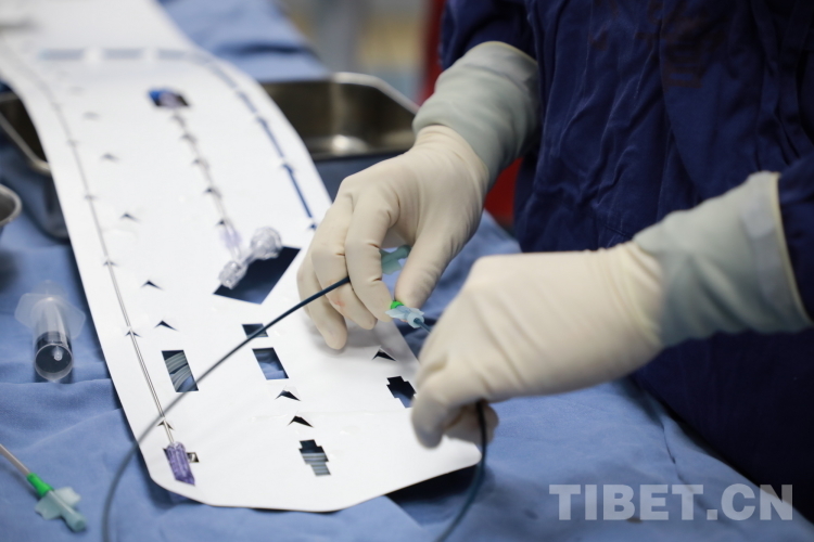 圖為北醫(yī)三院專家團(tuán)隊(duì)在為來自青海省果洛藏族自治州的先心病患兒手術(shù)時(shí)使用的直徑僅4毫米的介入導(dǎo)管 攝影:劉莉
