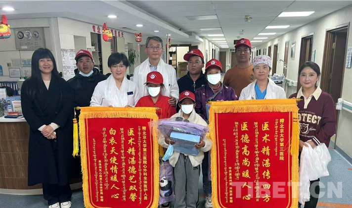 圖為3名來自青海省果洛藏族自治州的先心病患兒及患兒家屬等向北醫(yī)三院敬贈(zèng)錦旗 攝影:宮禧