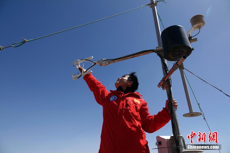 圖為觀測站現(xiàn)場,第二次青藏科考隊員、中科院空天院博士生陳舊對觀測設(shè)備進行維護。 中新社記者 孫自法 攝