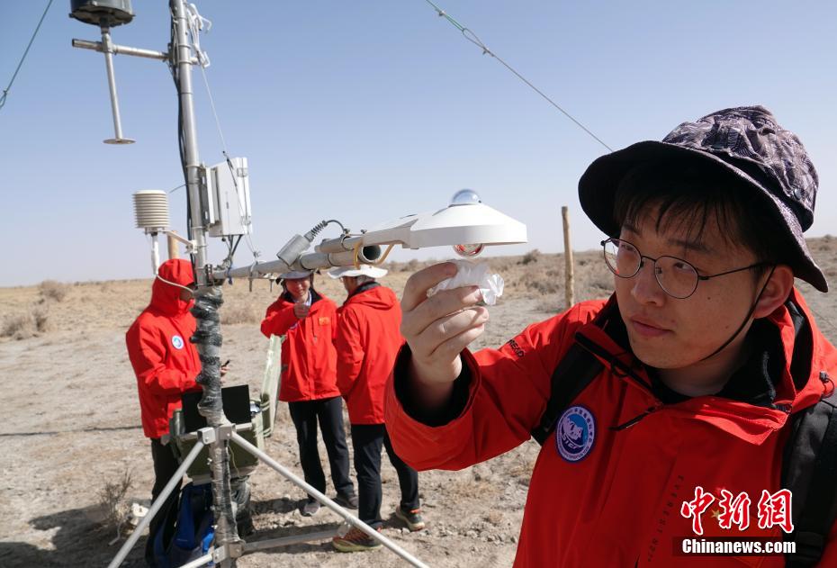 第二次青藏科考隊員、中科院空天院博士生呂云哲在觀測站現(xiàn)場維護擦拭觀測設(shè)備探頭。中新社記者 孫自法 攝
