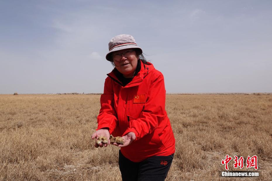 新建觀測(cè)站勘查選址過(guò)程中,第二次青藏科考中科院空天院分隊(duì)領(lǐng)隊(duì)賈立研究員展示介紹濕地中凝結(jié)的鹽塊。孫自法 攝