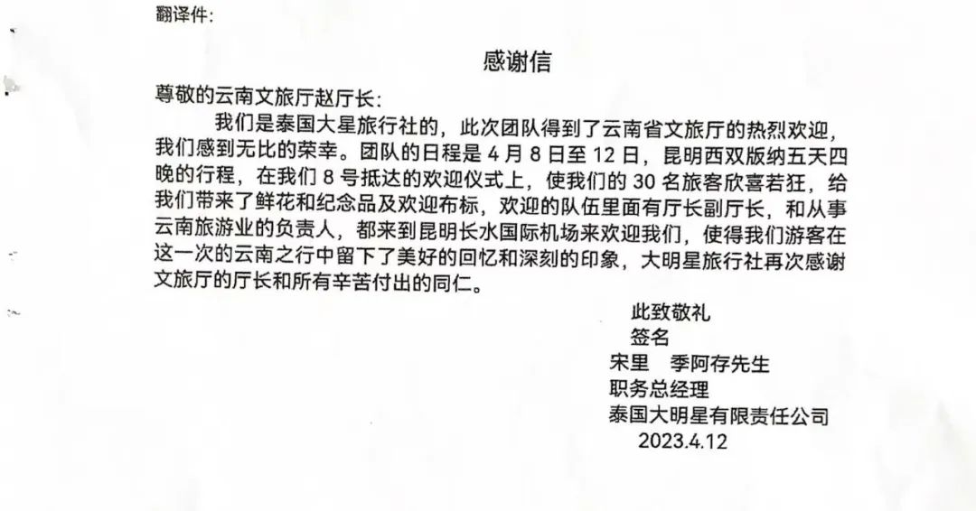 “在這四晚五天的云南之行中,我們無時(shí)無刻不心懷感激感恩之情,此次旅途給我們留下了深刻的印象。開心快樂一路相隨,云南的風(fēng)景美、人更美,一路上遇到的人,對待外國游客是多么的友善和可愛?!比涨?,一封寫有30位泰國游客名字的感謝信送到云南省文化和旅游廳,字里行間中透露著真摯情感和濃濃的感謝之意,傳遞著泰國游客對云南的喜愛,對云南之行的滿意……