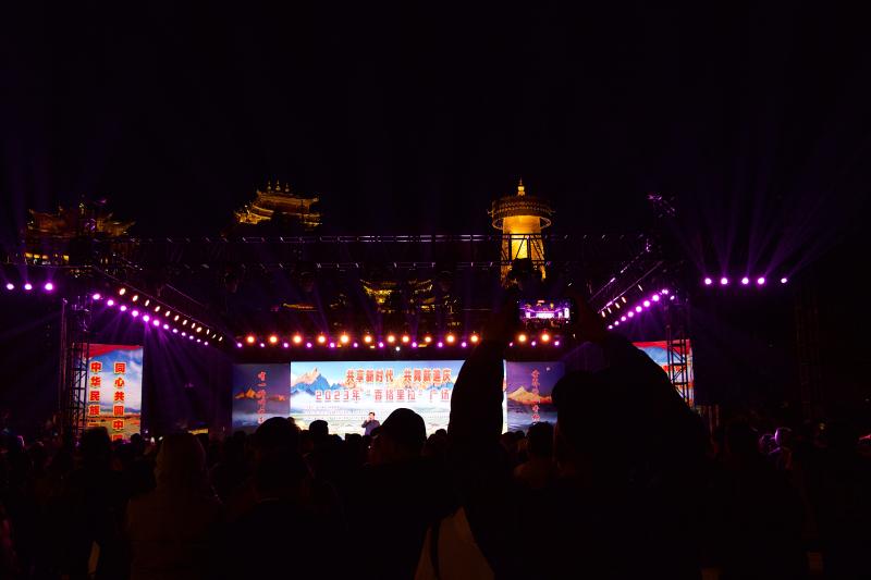 演唱會(huì)結(jié)束后,“彩云之南等你來”世界的香格里拉歡迎您——夜間群眾文藝演出活動(dòng)隨即開始,現(xiàn)場(chǎng)燈光閃爍,游客與當(dāng)?shù)厝罕娨黄?,圍著廣場(chǎng)中央的篝火載歌載舞,盡情體驗(yàn)縱情舞蹈的歡樂。