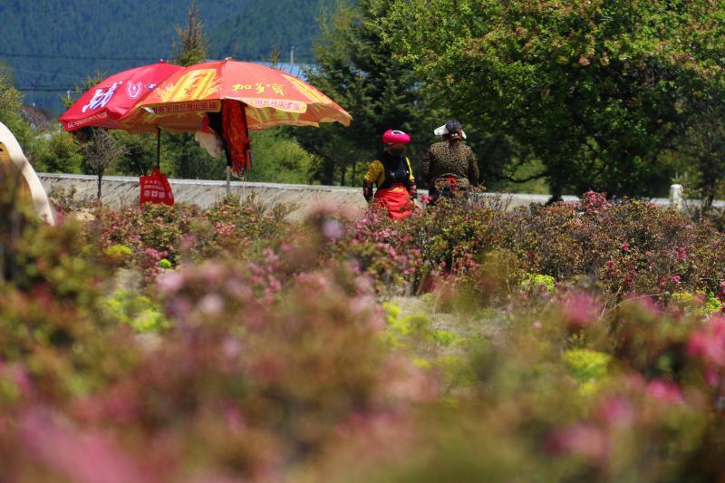 夏天,位于香格里拉市小中甸鎮(zhèn)的杜鵑花海競相綻放,紫色、粉色的花朵開成了海,與藍(lán)天白云遙相呼應(yīng),藏房點(diǎn)綴其間,美不勝收。每當(dāng)花季,當(dāng)?shù)氐睦习傩赵诨ê_厰[起特色美食,牦牛酸奶、苦蕎粑粑、酥油茶等美食供游客享用,坐在花海邊,品嘗當(dāng)?shù)靥厣朗?,是這個(gè)夏天小中甸花海獨(dú)有的浪漫。