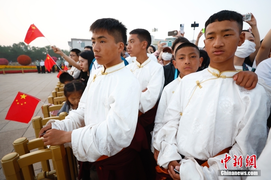 圖為觀看升旗儀式的藏族青少年。中新社記者 富田 攝