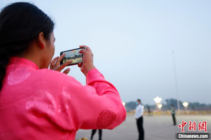 “六一”兒童節(jié)一早,來(lái)自青海省玉樹(shù)藏族自治州兒童福利院的部分藏族青少年在天安門廣場(chǎng)觀看升旗儀式。圖為鬧增拉毛在拍攝五星紅旗。中新社富田 攝