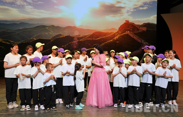 圖為孩子們?cè)谖枧_(tái)上和中央民族歌舞團(tuán)國家一級(jí)歌唱家劉媛媛共同表演 攝影:王茜