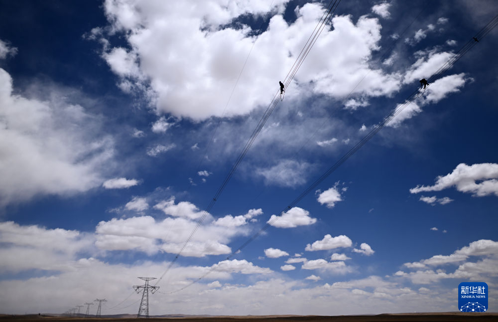 在青海省海西蒙古族藏族自治州格爾木市唐古拉山鎮(zhèn)境內(nèi),檢修人員在走線巡檢中(6月3日攝)。新華社 潘彬彬 攝