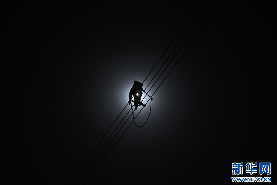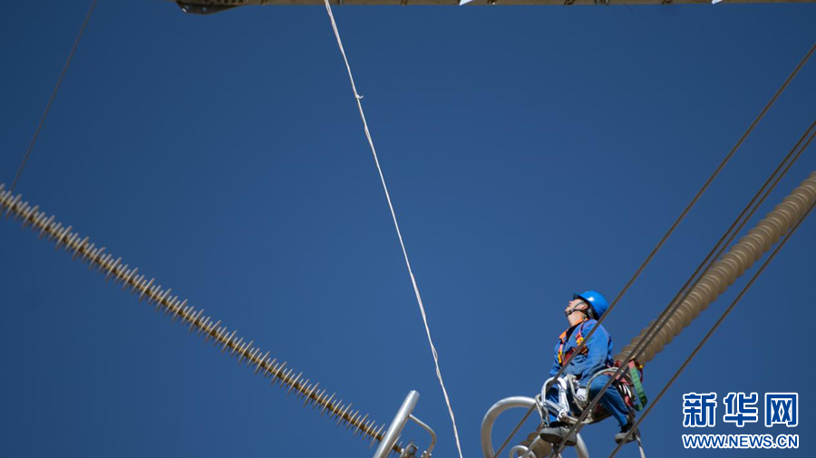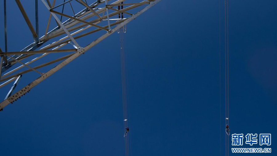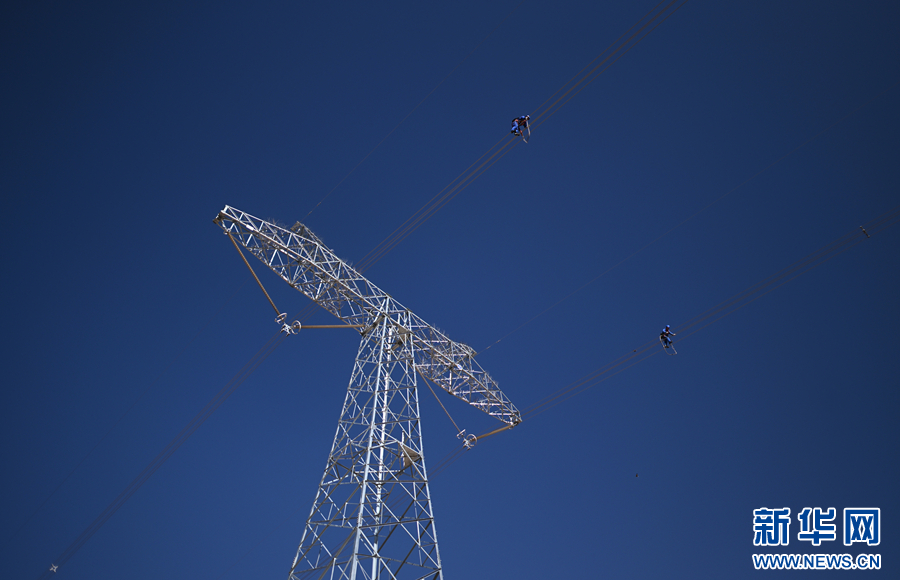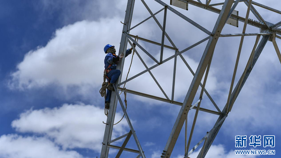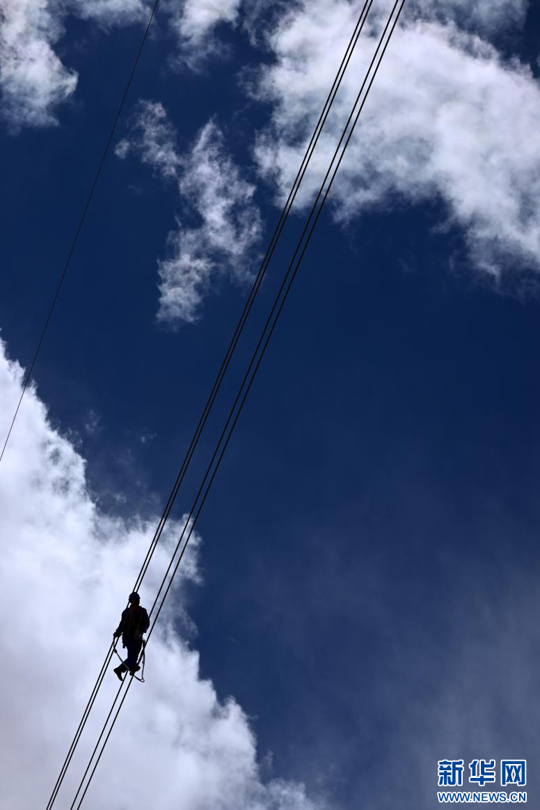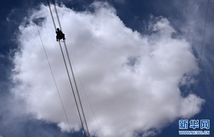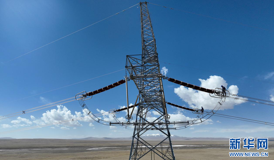 在平均海拔超過4500米的長江源頭腹地,檢修人員克服高寒缺氧的環(huán)境,在云端走線巡檢,成為“電力天路”一道獨(dú)特的風(fēng)景。新華社記者 張宏祥 攝