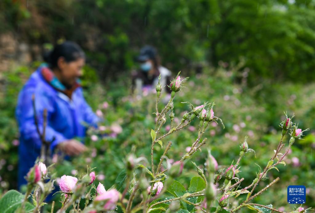 6月14日,在四川省阿壩州小金縣新橋鄉(xiāng)共和村,當(dāng)?shù)胤N植戶在采摘玫瑰鮮花。新華社記者 王曦 攝