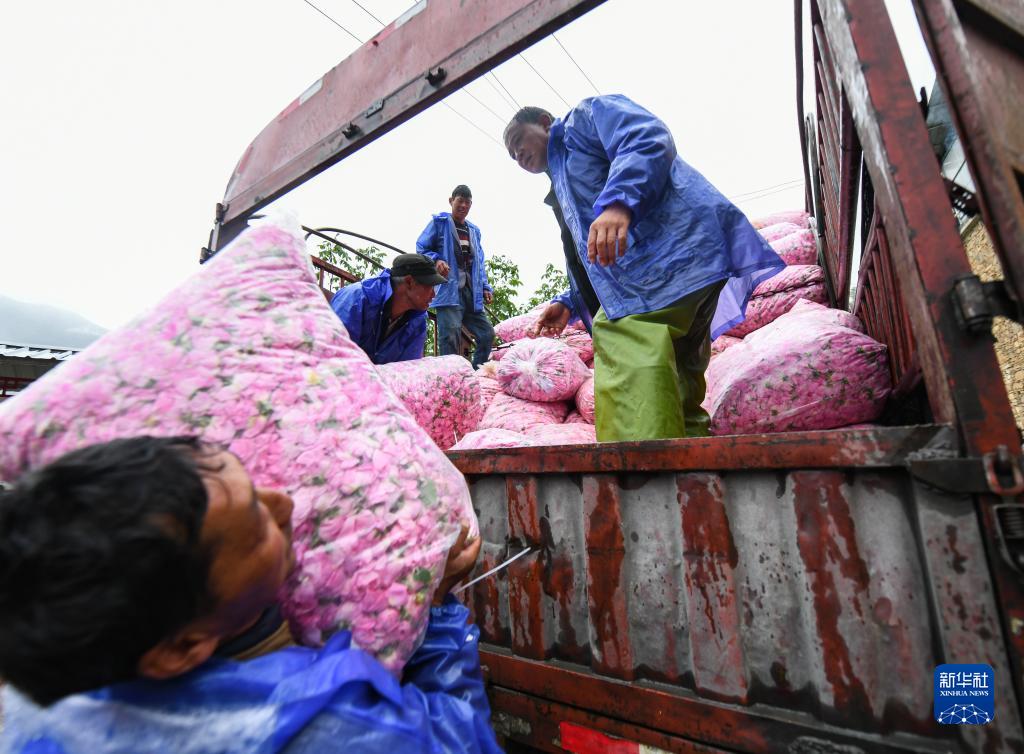 6月14日,在四川省阿壩州小金縣新橋鄉(xiāng)共和村,“金山玫瑰”基地的工作人員在收購當(dāng)?shù)胤N植戶的玫瑰鮮花。新華社記者 王曦 攝