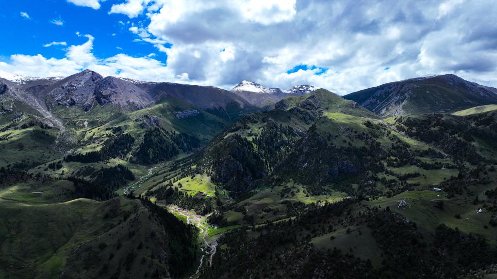 這是6月18日在青海省玉樹藏族自治州囊謙縣境內(nèi)拍攝的三江源地區(qū)風(fēng)光(無人機照片)。 新華社記者 張龍 攝