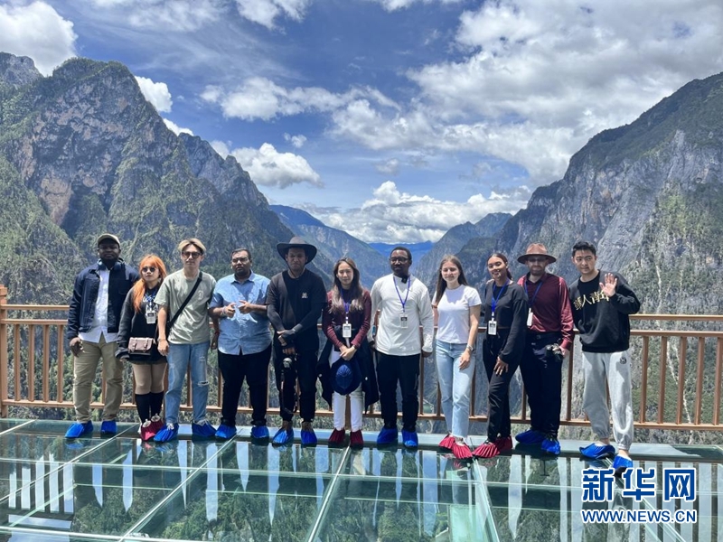 6月29日,外國“Z世代”青年代表在香格里拉大峽谷巴拉格宗景區(qū)合影留念。新華網(wǎng) 朱夢娜 攝