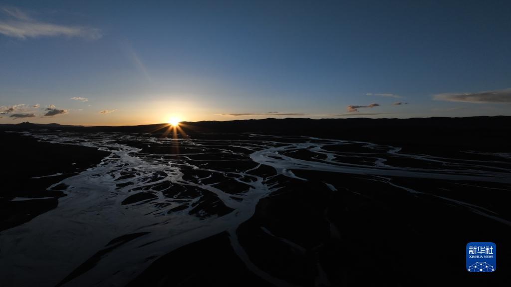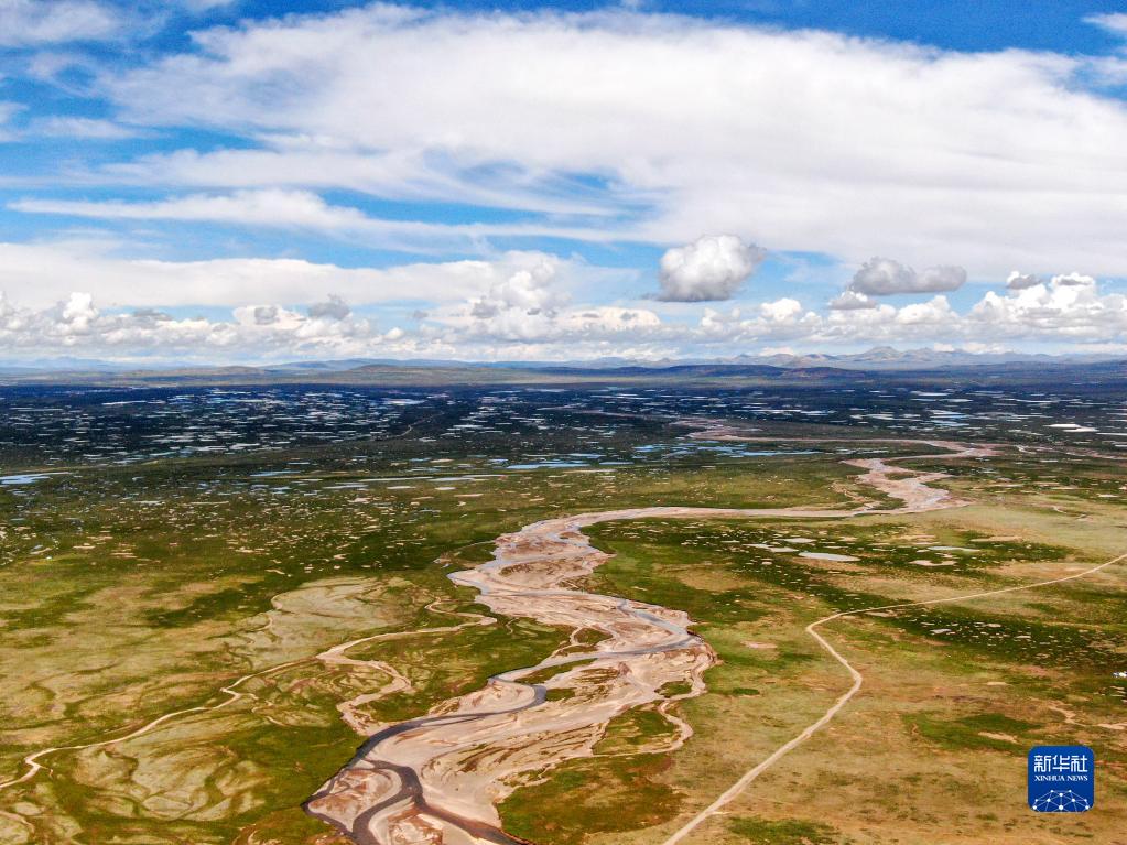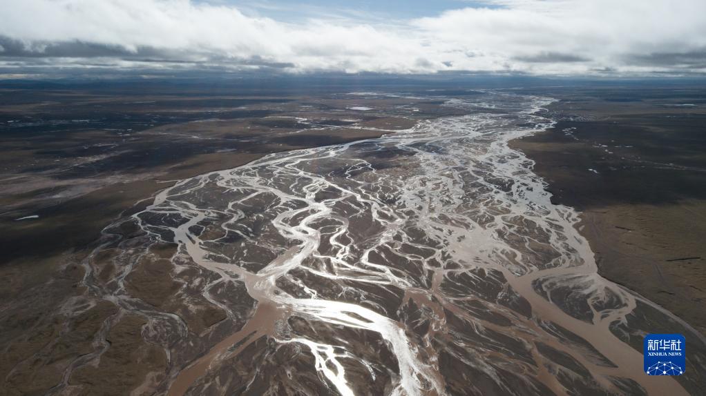 這是2022年7月27日在長江源地區(qū)拍攝的囊極巴隴河道,長江正源沱沱河和南源當曲在此匯合(無人機照片)。新華社記者 肖藝九 攝