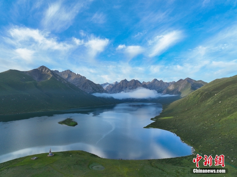7月19日,盛夏時(shí)節(jié),青海省果洛藏族自治州久治縣年保玉則山間云霧繚繞,山下鮮花盛開(kāi),水清草豐,靜謐的湖水與嶙峋的山巒相映成趣,宛如仙境。年保玉則總面積3469平方公里,山形如蓮花,保存有冰蝕地貌、冰磧地貌、現(xiàn)代冰川等地質(zhì)遺跡。(無(wú)人機(jī)照片)中新社記者 馬銘言 攝