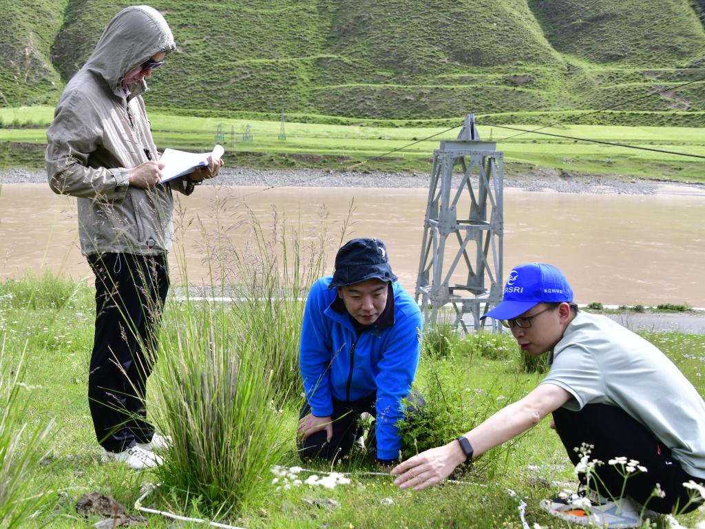 這是2023年江源綜合科考隊(duì)員任斐鵬(中)、李昊(左)、嚴(yán)智偉在長(zhǎng)江源區(qū)的通天河直門(mén)達(dá)河段開(kāi)展植被樣方調(diào)查。新華社記者李勁峰 攝