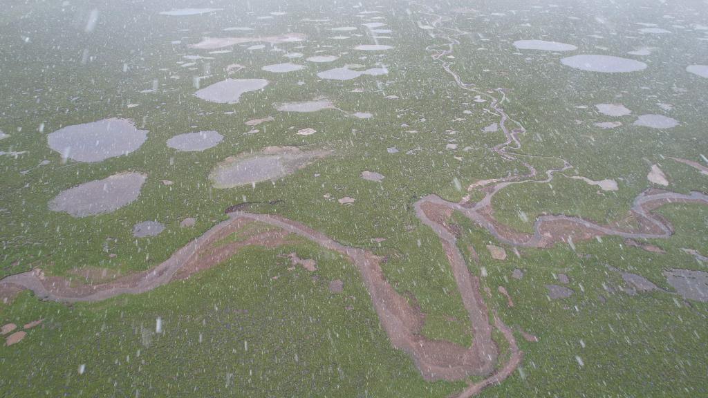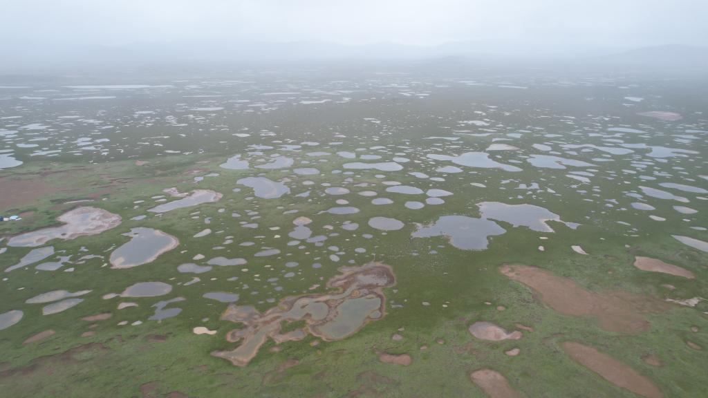 記者在距離當曲源頭不到10公里處升起無人機看到,沼澤濕地中,大大小小的沼澤湖泊星羅棋布。
