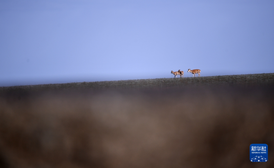 7月27日,兩只藏羚羊在可可西里境內(nèi)活動。新華社記者 張宏祥 攝
