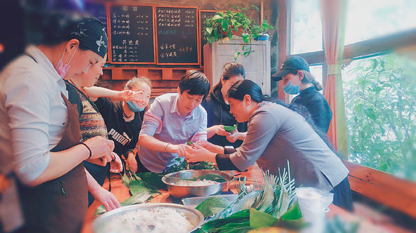 在央切爾鍋莊,藏族店員和漢族客人一起過(guò)端午,包粽子。受訪者供圖
