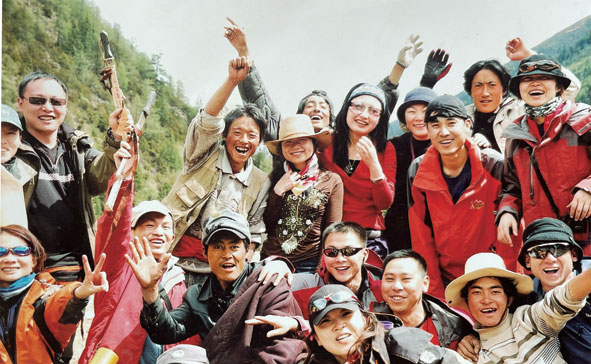 塔公村村長(zhǎng)尼瑪降澤(手舉最高者)早年與客人們的合影。王京雪翻 拍