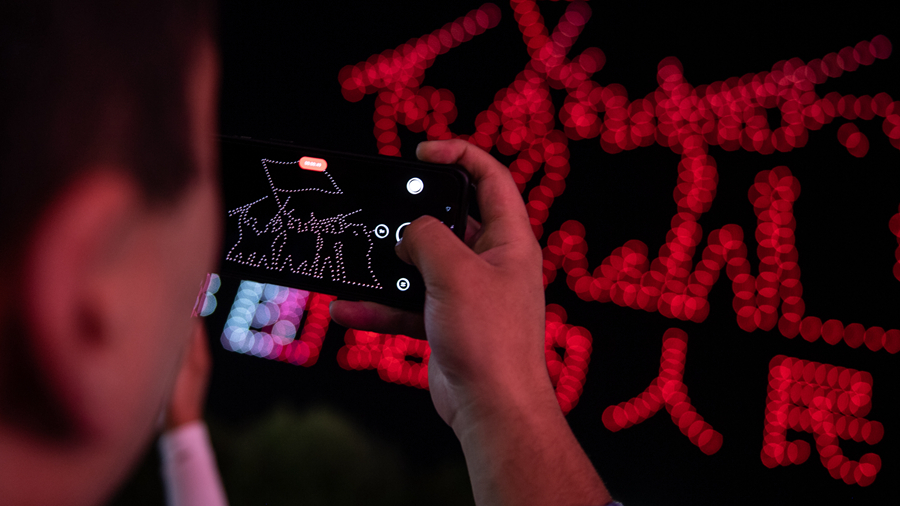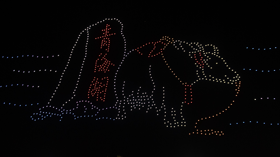 7月31日,慶祝青海省海南藏族自治州成立70周年藏族服飾藝術(shù)嘉年華迎賓晚會(huì)現(xiàn)場的無人機(jī)編隊(duì)表演。