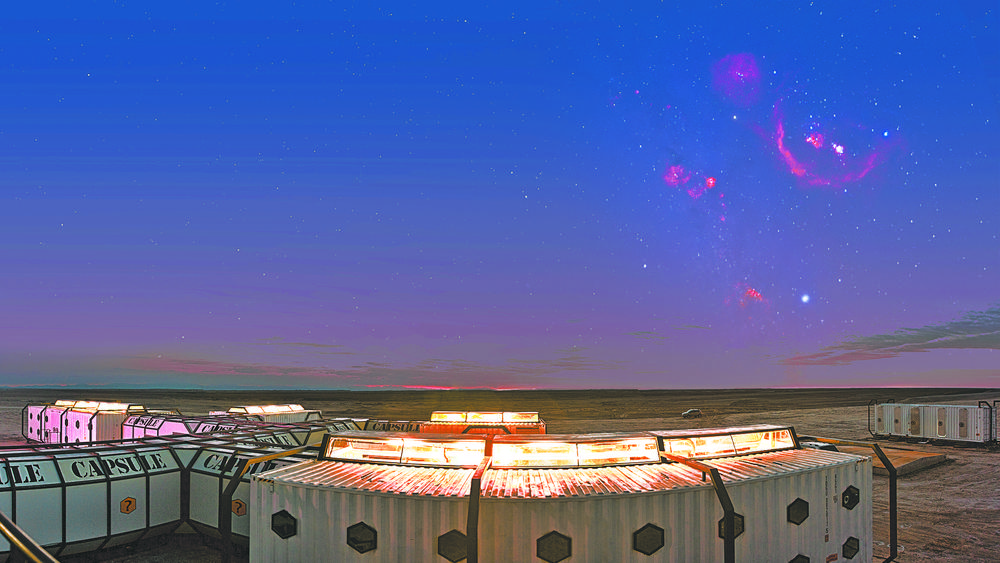 “我們的建筑風(fēng)格是模擬未來(lái)人類移居火星后的生存環(huán)境,有‘總部大樓’‘火星艙’等。”順著袁振民手指的方向,才發(fā)現(xiàn),原來(lái)那些白色集裝箱正是營(yíng)地建筑的主體。