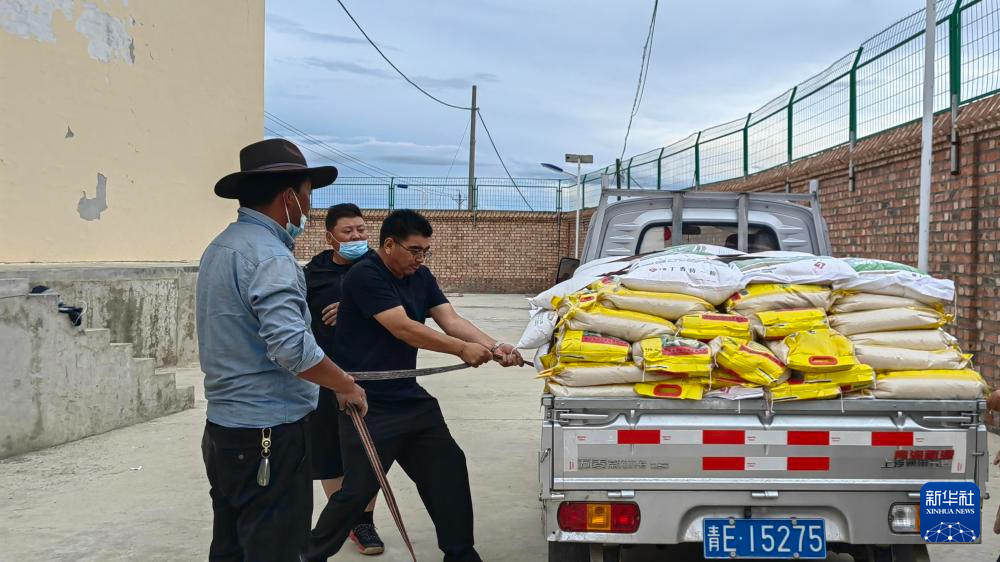 2022年8月17日,鄧官杰(左三)為同德縣唐谷鎮(zhèn)受災群眾搬運應急物資。同德縣應急管理局供圖