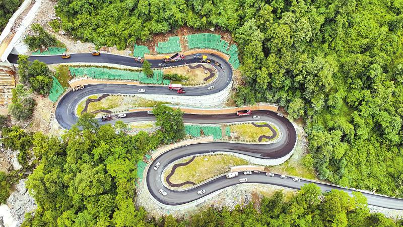 隨著道路基本修復(fù)完成,多個路段正進行瀝青路面鋪筑。俯瞰視角中,黑色的旅游公路盤山而上,逶迤山間。據(jù)介紹,海螺溝景區(qū)道路不是簡單重建,而是恢復(fù)提升,全線按三級公路標準建設(shè),路基全部拓寬至7.5米,并鋪設(shè)瀝青混凝土路面;部分急彎陡坡段進行了改善,提升了觀景臺、護欄的安全等級,行車舒適度大為提升。