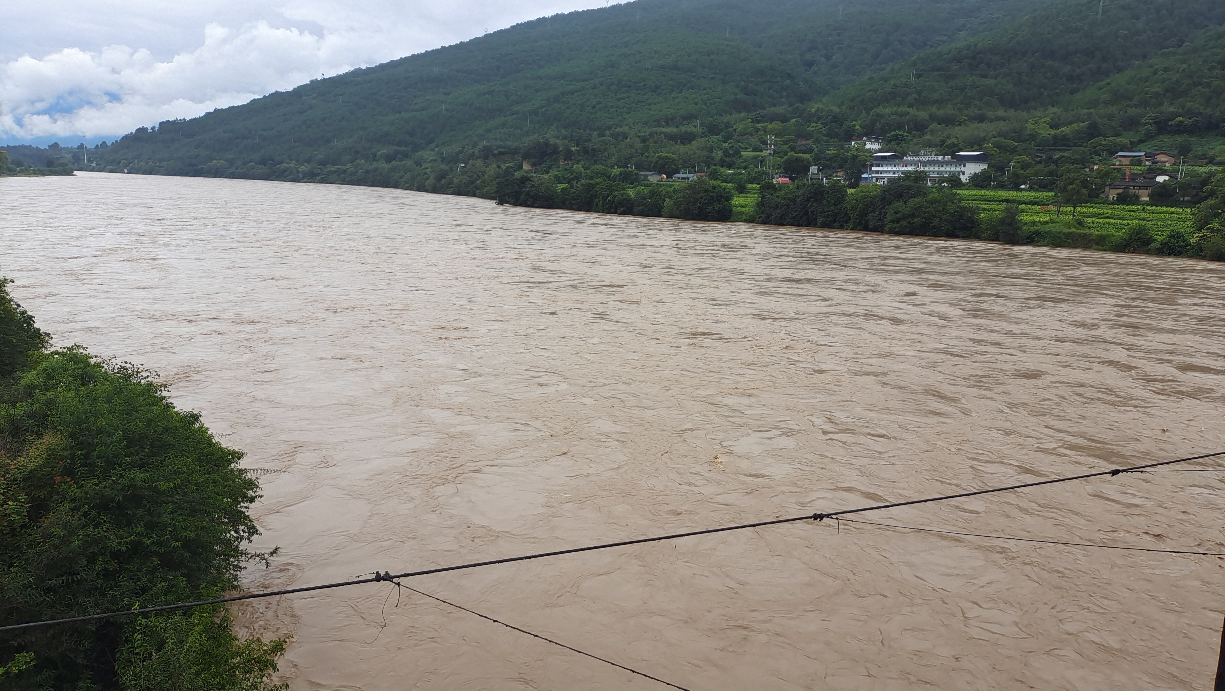 監(jiān)測數(shù)據(jù)顯示,8月21日15時下游金江鎮(zhèn)水文站水位1823.59米,超警戒1.09米,相應流量每秒4950立方米。隨著持續(xù)降水過程,金沙江水位持續(xù)上升,上江鄉(xiāng)至金江鎮(zhèn)臨江一線水位已逼近農(nóng)田,江水已沒過低洼地帶的楊柳林。