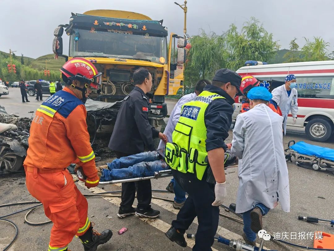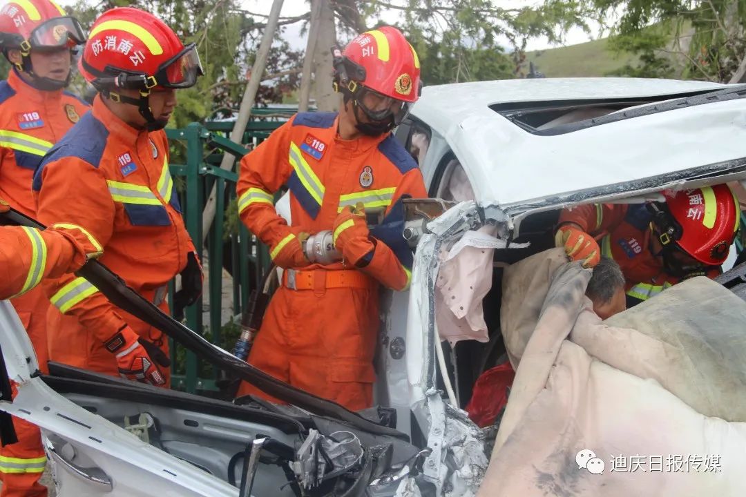 接到調(diào)令后,香格里拉消防救援站立即出動(dòng)2車13人前往處置,到達(dá)現(xiàn)場后,發(fā)現(xiàn)一輛小轎車與一輛貨車相撞,轎車嚴(yán)重受損變形,車內(nèi)安全氣囊已彈出,副駕駛位被困人員頭部、腿部多處受傷無法動(dòng)彈,意識(shí)模糊,有嚴(yán)重生命危險(xiǎn)。