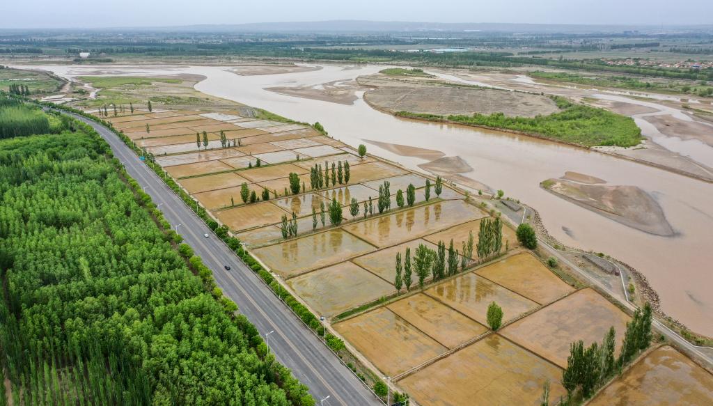 流經(jīng)寧夏青銅峽市境內(nèi)的黃河,滋潤(rùn)著岸邊水稻和各種植被(無人機(jī)照片,5月25日攝)。新華社記者馮開華 攝