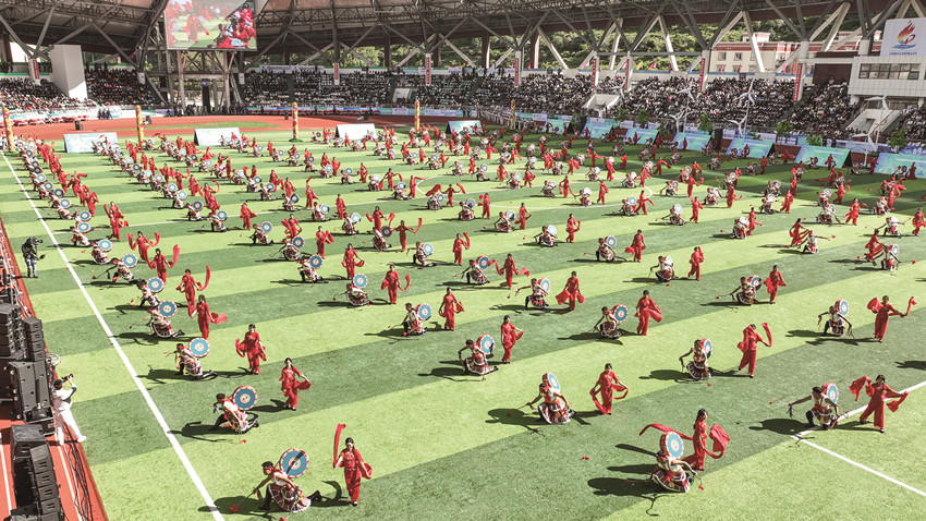來自四川省藏文學(xué)校的小伙們熱情奔放、姑娘們可愛生姿,由他們共同演繹的這支青春動感熱身操,瞬時點(diǎn)燃體育場氣氛,9000余雙眼睛注視著全場刮起的這輪“最炫民族風(fēng)”,觀眾席掌聲雷動、歡呼聲響徹。