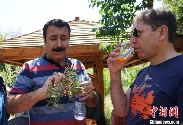 圖為兩位外國政黨代表團成員在坎布拉國家地質(zhì)公園內(nèi)品嘗沙棘果和沙棘飲品。馬銘言 攝