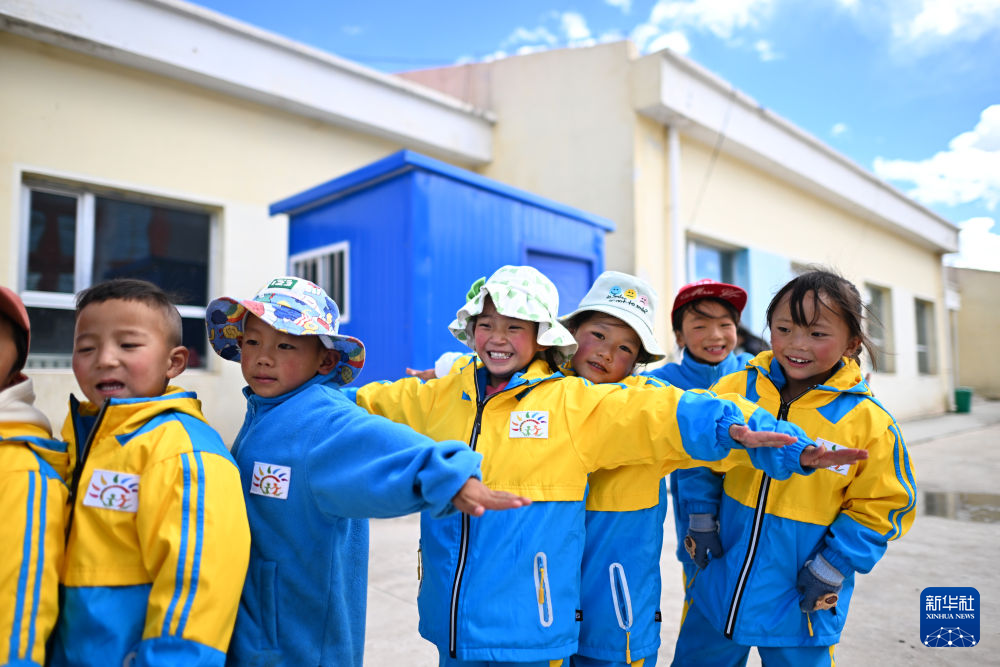 在青海省玉樹藏族自治州曲麻萊縣秋智鄉(xiāng)布甫村陽光幼兒園,孩子們走出教室準備開始戶外活動(9月14日攝)。新華社記者 張宏祥 攝