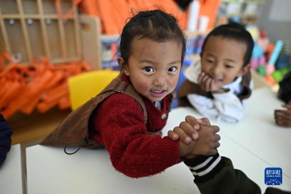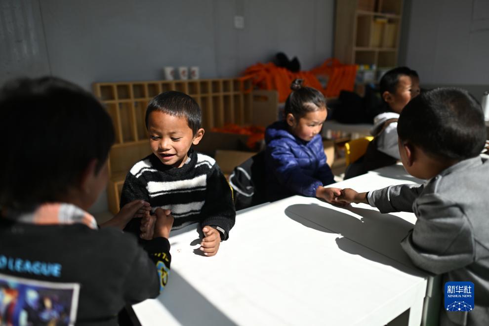 在青海省玉樹藏族自治州曲麻萊縣秋智鄉(xiāng)布甫村陽光幼兒園,丁增巴桑(左)和伙伴們在教室內玩耍(9月14日攝)。新華社記者 張宏祥 攝