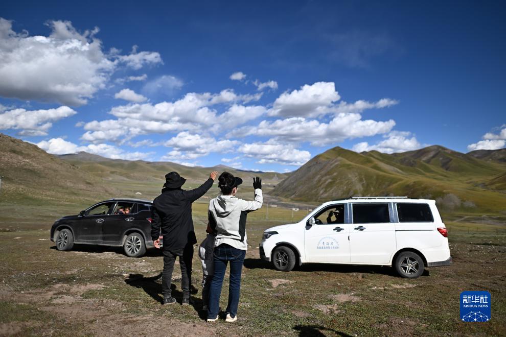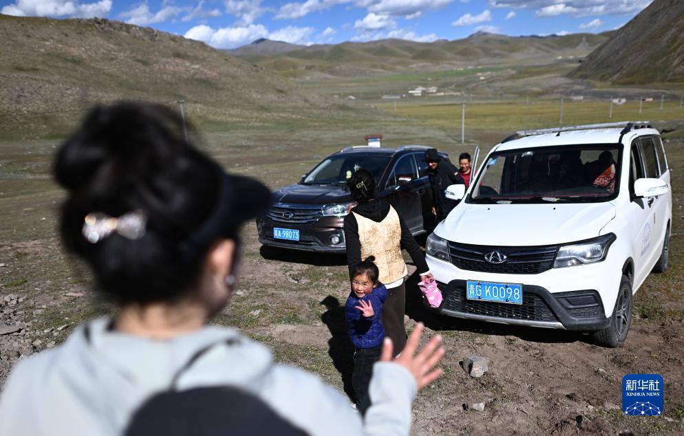 在青海省玉樹藏族自治州曲麻萊縣秋智鄉(xiāng)布甫村陽光幼兒園,老師與學生家長告別(9月14日攝)。新華社記者 張宏祥 攝